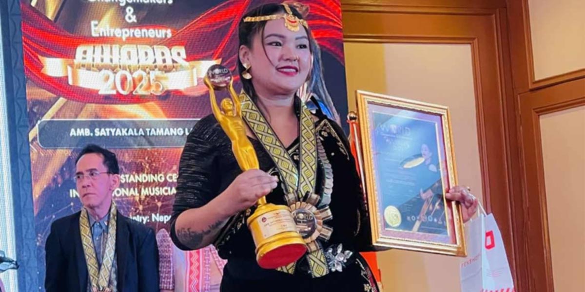 एएमएस म्युजिक एण्ड इन्टरटेनमेन्टकी अध्यक्ष सत्यकला तामाङलाई फिलिपिन्समा अन्तर्राष्ट्रिय अवार्डद्वारा सम्मान गरिएको छ । शनिबार फिलिपिन्समा आयोजित एक कार्यक्रममा वर्ल्ड चेञ्जमेकर्स एण्ड एन्टरप्रेनरसिप अवार्ड २०२५ बाट उनलाई सम्मान गरिएको हो ।